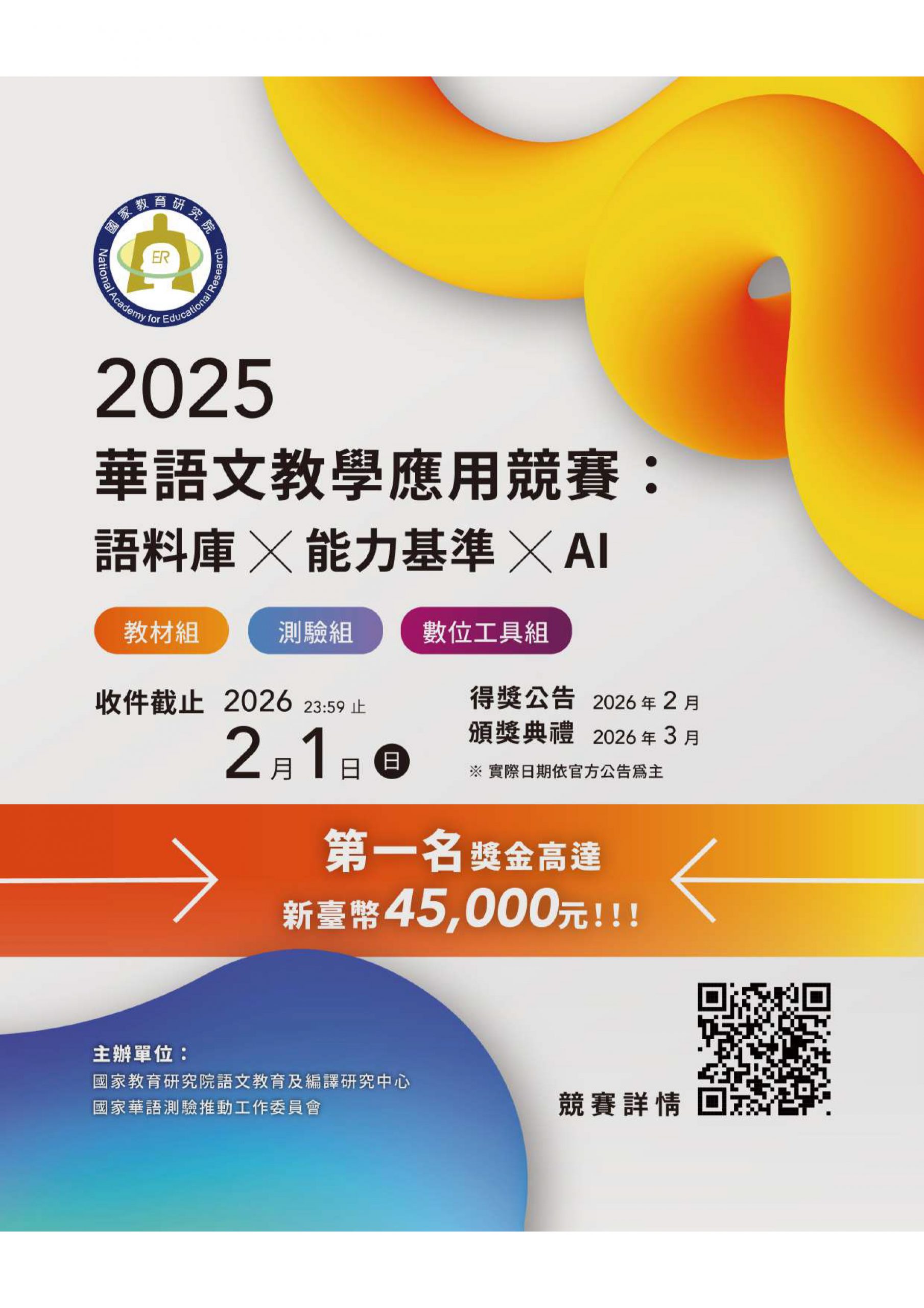 國家教育研究院自105年起,每年舉辦華語文語料庫與能力基準應用相關競賽活動,迄今已舉辦9屆。今年主題為「語料庫×能力基準×AI」。相關資訊如下:
