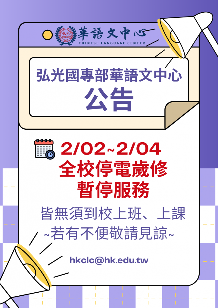 【重要公告】115/02/02(一)至 115/02/04(三)進行高壓用電設備年度歲修,全校停電 3 日