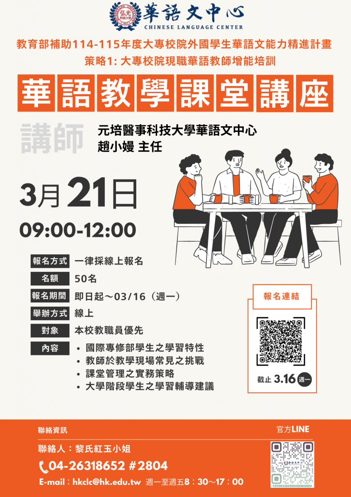 本次講座特別邀請 元培醫事科技大學 華語文中心趙小嫚主任擔任主講,將以「華語教學課堂管理」為主題,分享其於華語教學現場之課堂管理理念與實務經驗。透過專業講解與案例分享,協助教師精進課堂經營能力,提升教學品質。
